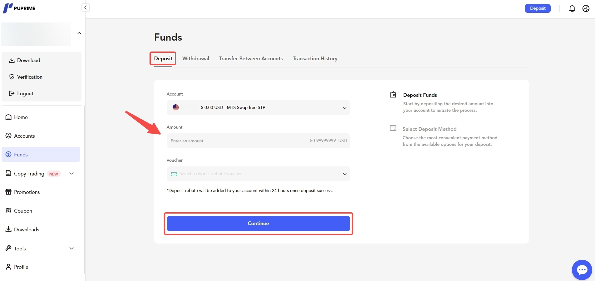 Click "Deposit", select the trading account you wish to fund, enter the deposit amount, and click "Continue".