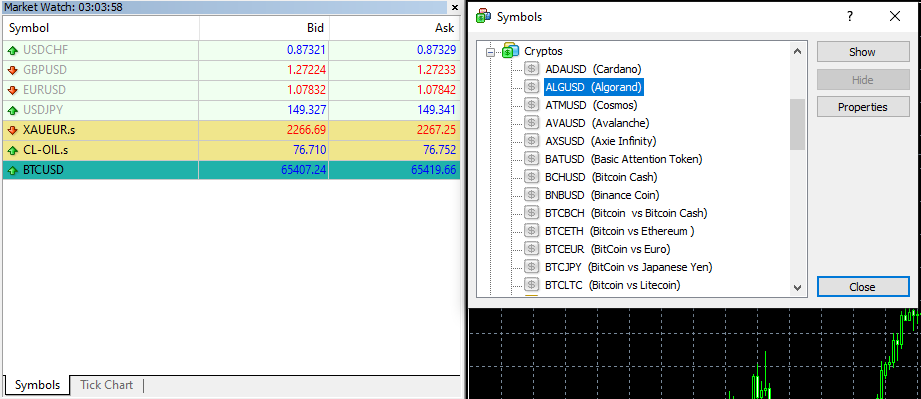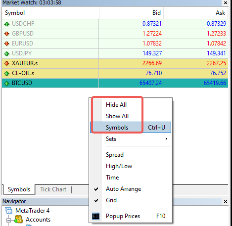 If you want to view more products, you can right-click on the "Market Watch” in the MetaTrader platform and select "Symbols" and add the products you want to view by clicking "Show" or you can select "Show all" to see all products.