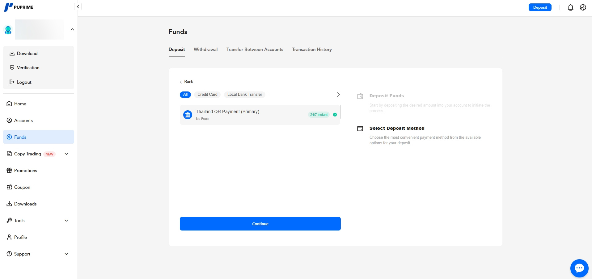 - Click "Deposit", select the trading account you wish to fund, enter the deposit amount, and click "Continue".