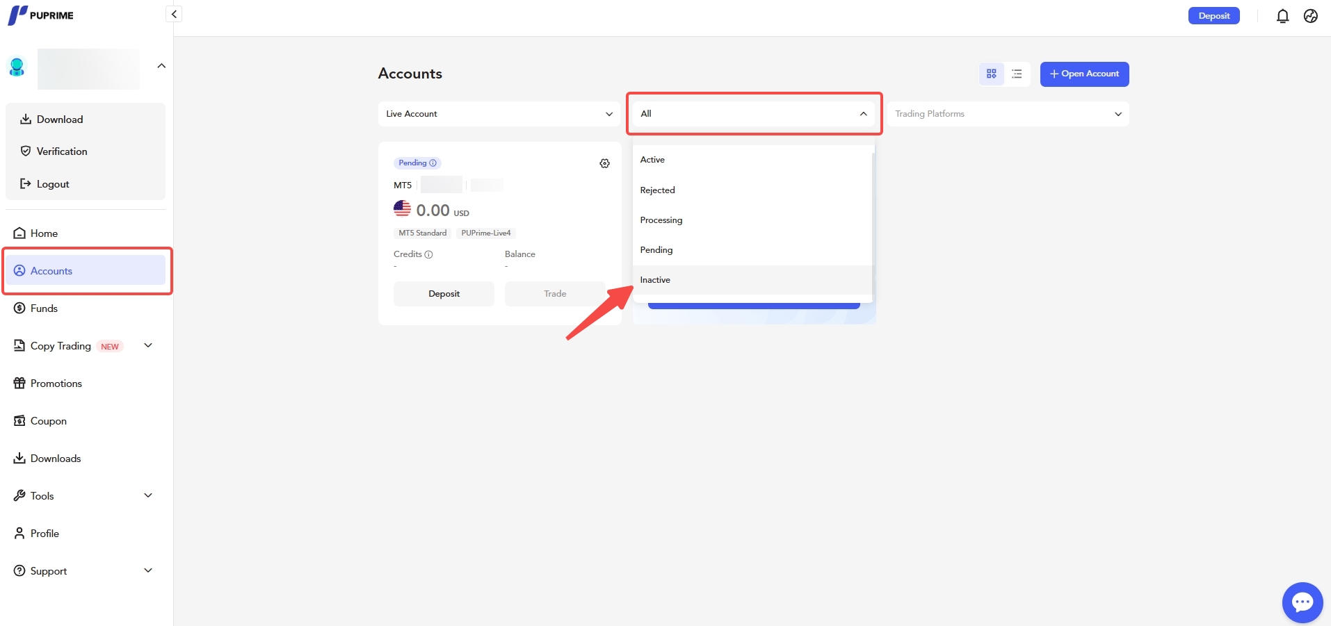 Note: Archived accounts cannot be used for trading or deposits. You can only view account details in read-only mode.